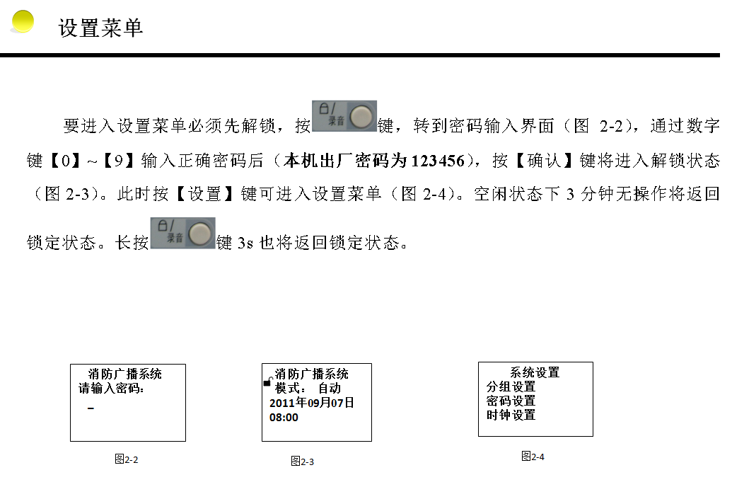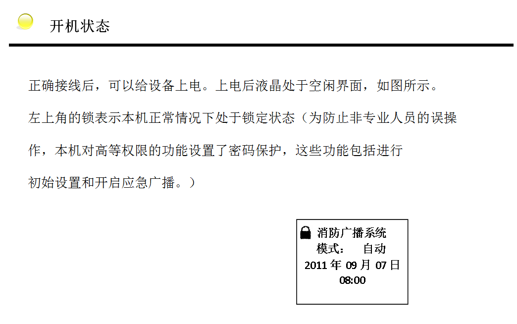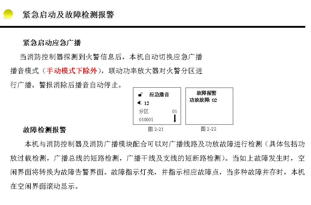 單純作為應(yīng)急廣播使用,解鎖狀態(tài)下按【應(yīng)急廣播】鍵或接收到火警信號時自動進(jìn)入。紅色狀態(tài)指示燈亮,功率放大器輸出音量不可調(diào)節(jié)。
