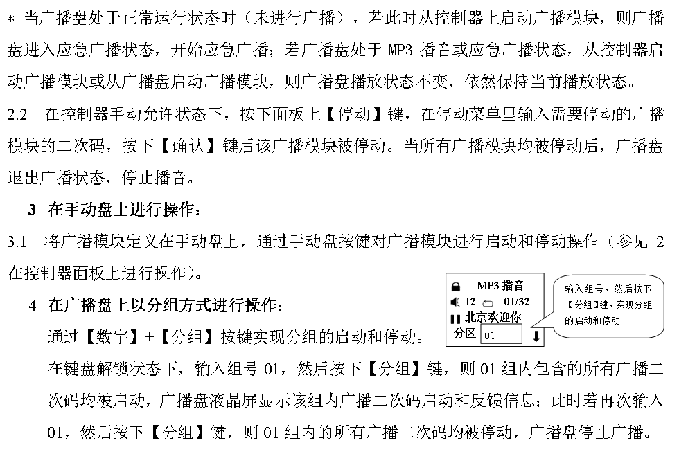 本機(jī)有外線、MP3、話筒、應(yīng)急廣播四種播音模式。其中外線與MP3屬于背景廣播,可自由啟閉。話筒播音包含應(yīng)急、背景兩種模式。應(yīng)急廣播單純?yōu)閼?yīng)急使用。