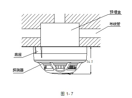 JTY-GM-GST9611海灣消防點(diǎn)型光電感煙火災(zāi)探測器安裝方式示意圖如圖1-7所示,接線盒可采用86H50型標(biāo)準(zhǔn)預(yù)埋盒。